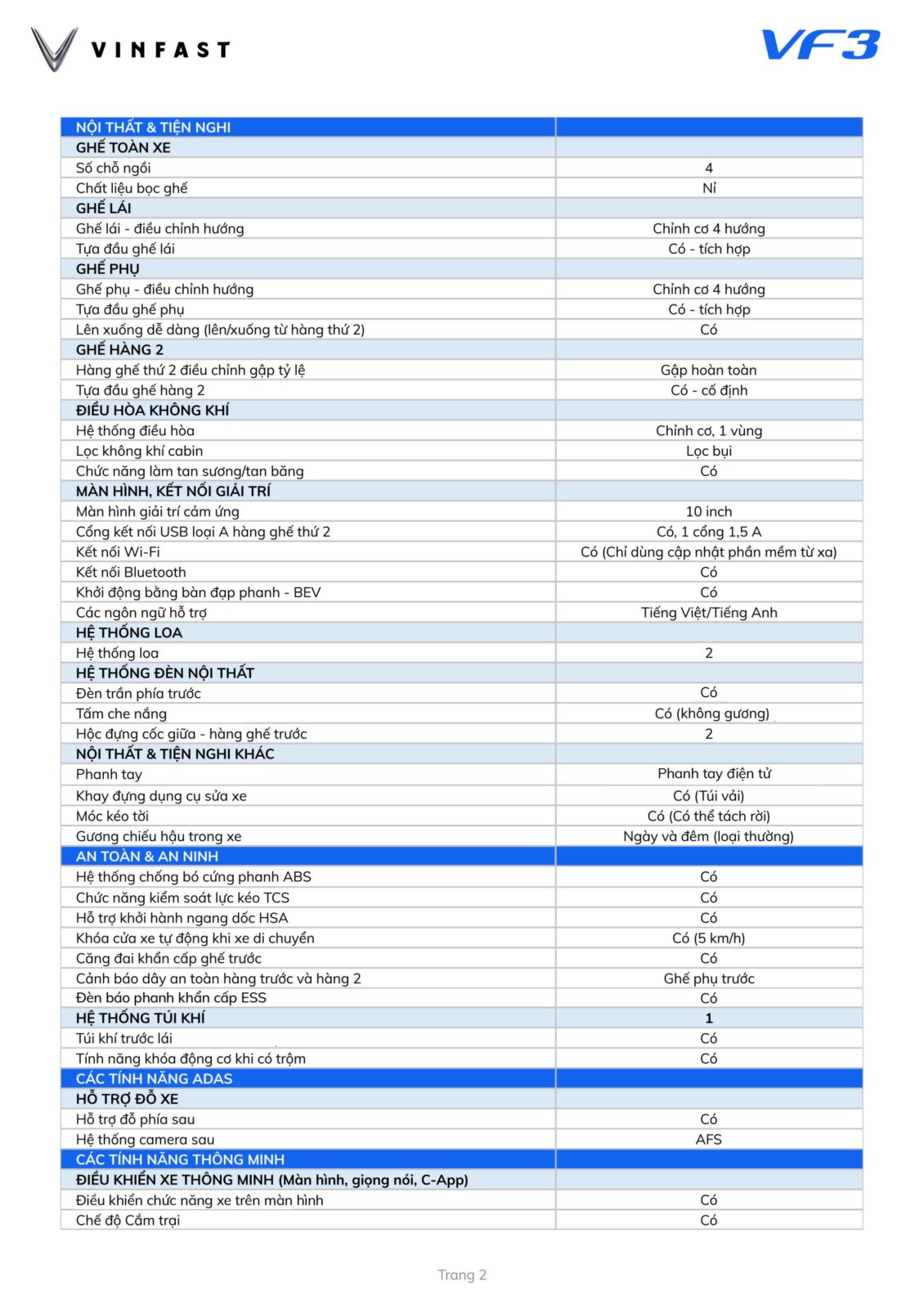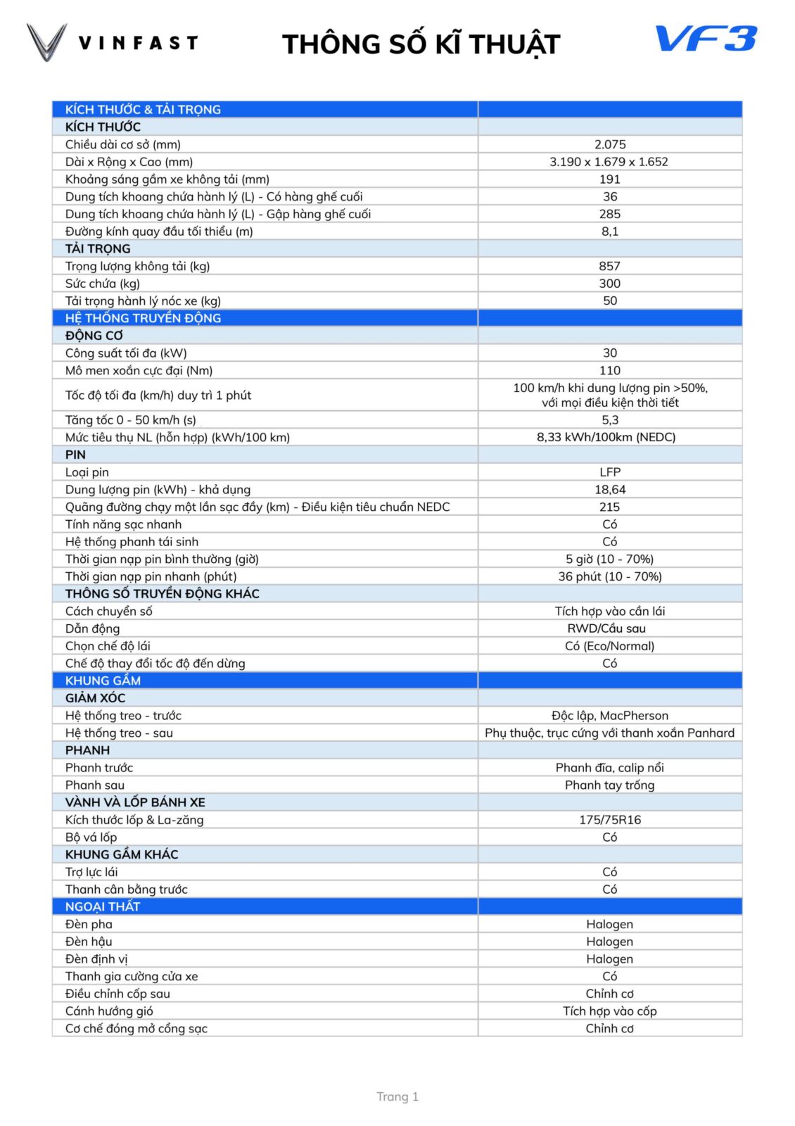THÔNG SỐ KỸ THUẬT VINFAST VF3